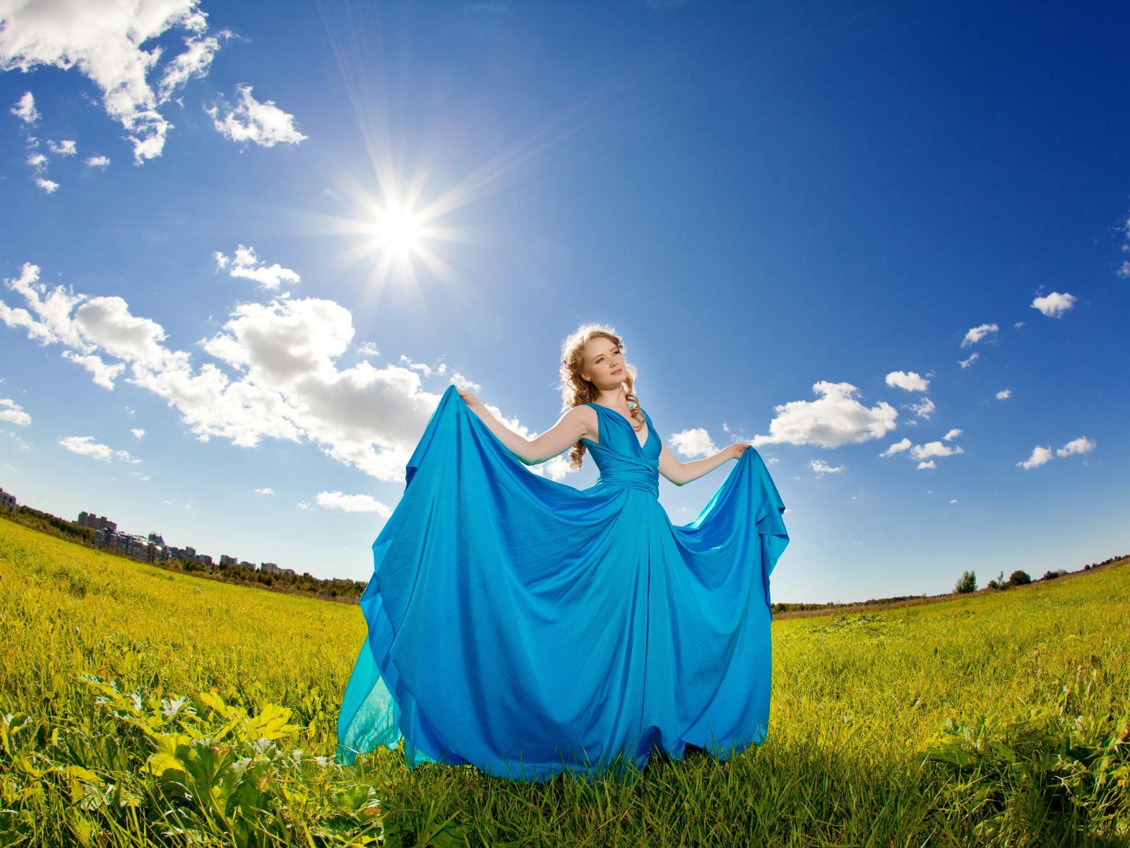 Wallpaper Girl in a beautiful blue dress against the sky