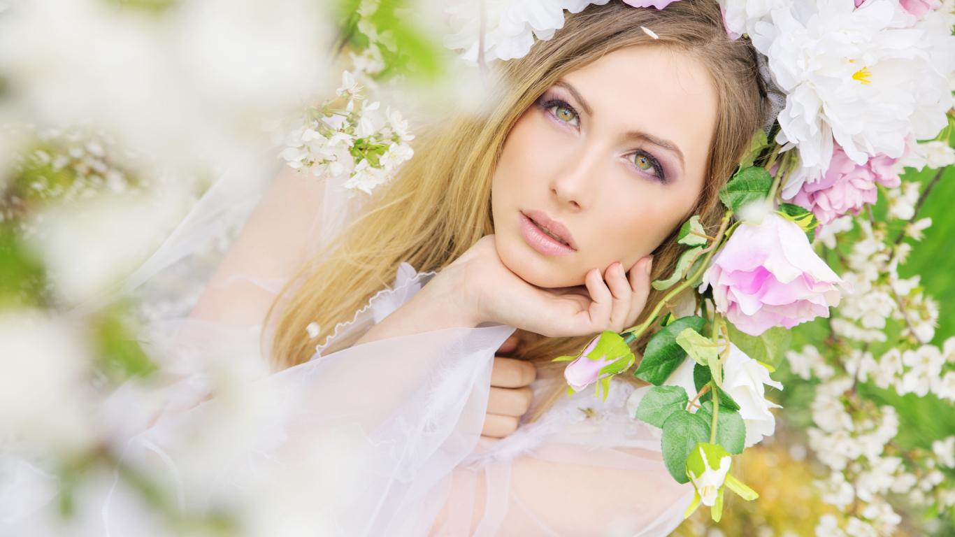 Wallpaper Green-eyed girl in the flowers of the rose