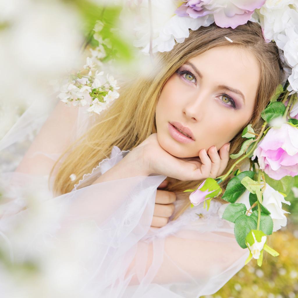 Wallpaper Green-eyed girl in the flowers of the rose