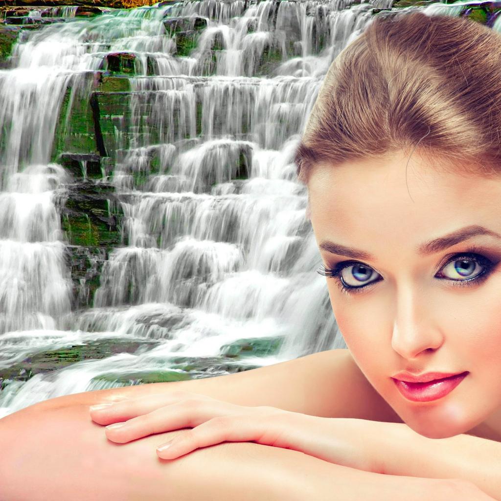Wallpaper Beautiful gentle girl on a waterfall background