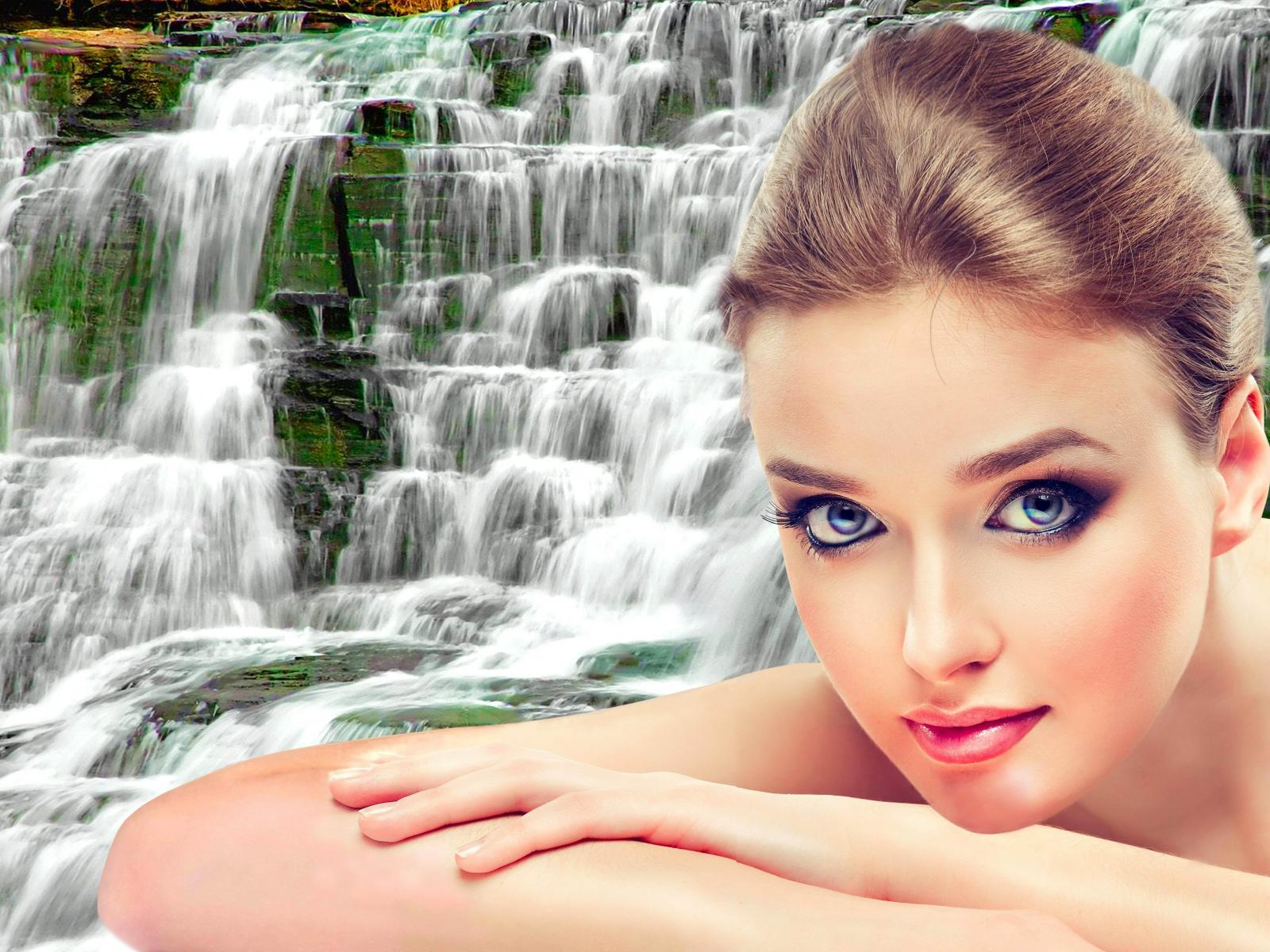 Wallpaper Beautiful gentle girl on a waterfall background