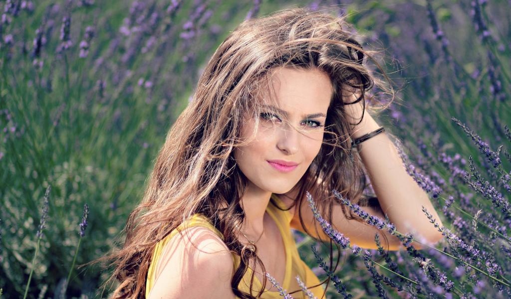 Wallpaper Beautiful brown-haired woman in lavender flowers