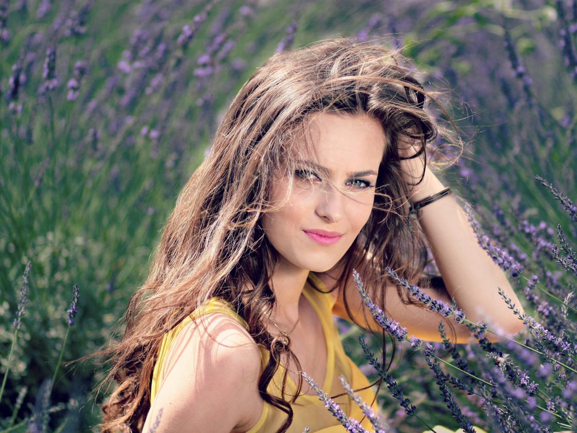 Wallpaper Beautiful brown-haired woman in lavender flowers