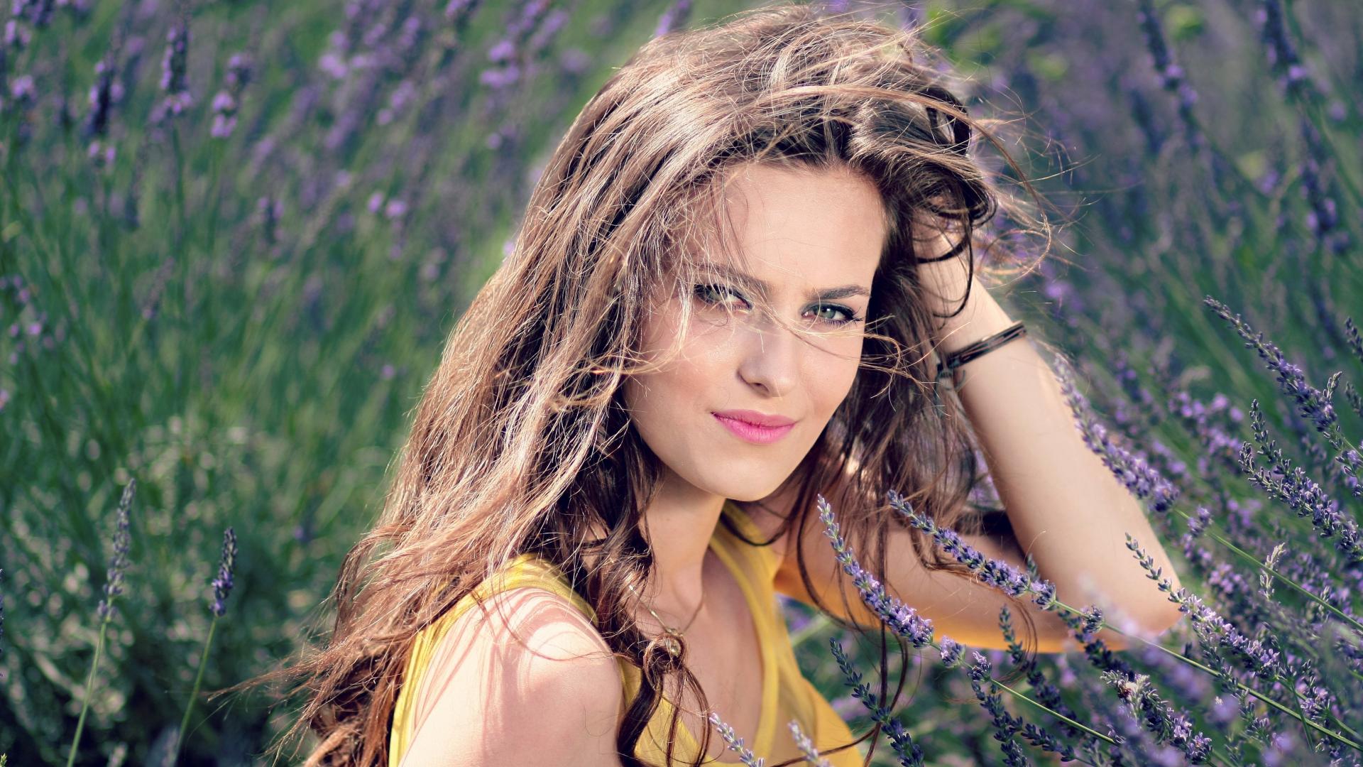 Wallpaper Beautiful brown-haired woman in lavender flowers