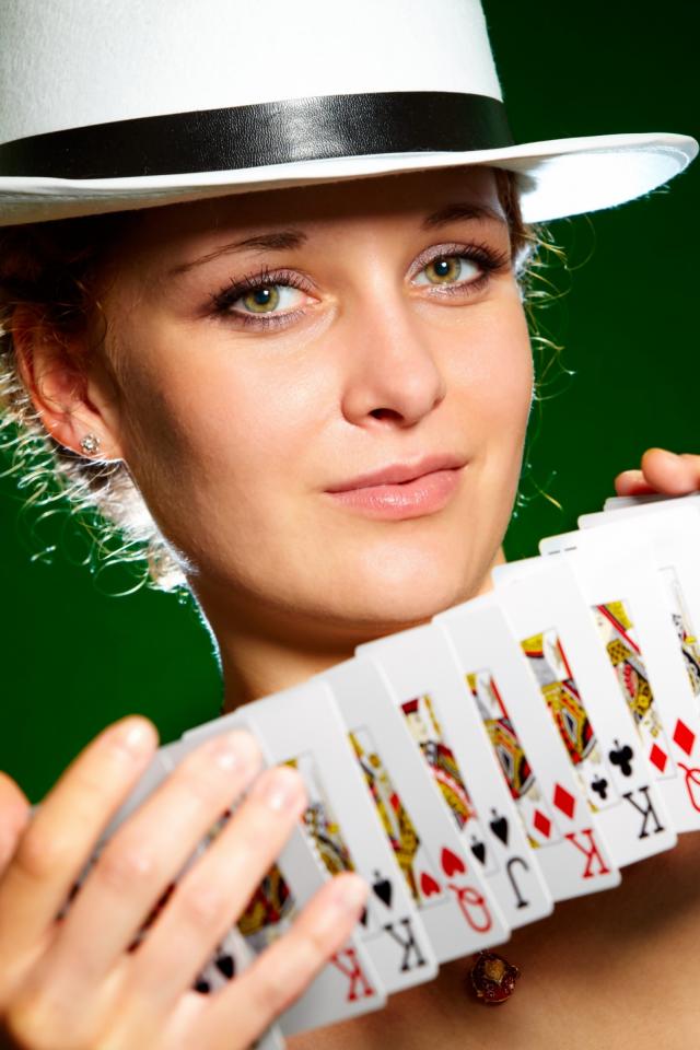 Wallpaper Young girl in a hat with cards in hands