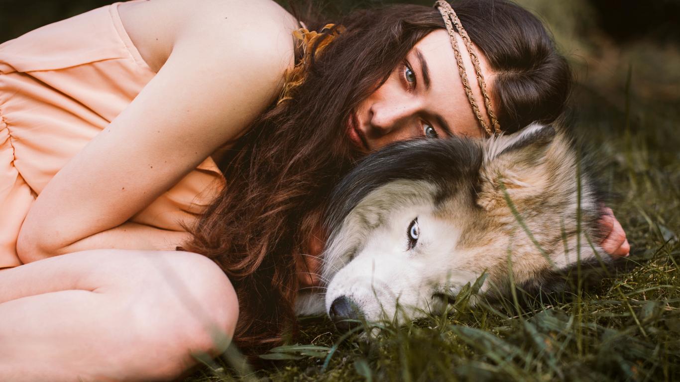 Wallpaper Young girl with a hussy breed dog lies on the grass
