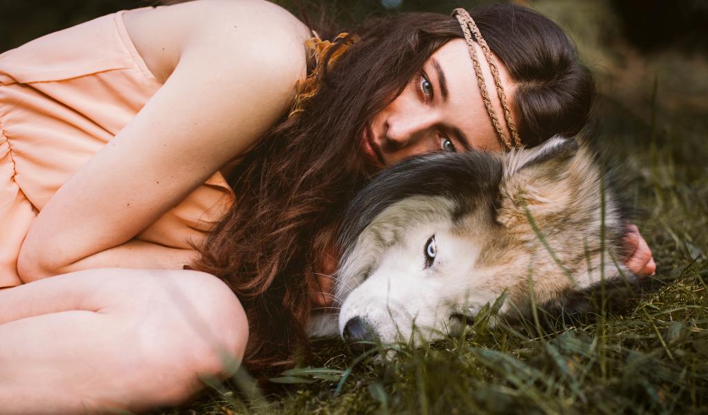 Wallpaper Young girl with a hussy breed dog lies on the grass