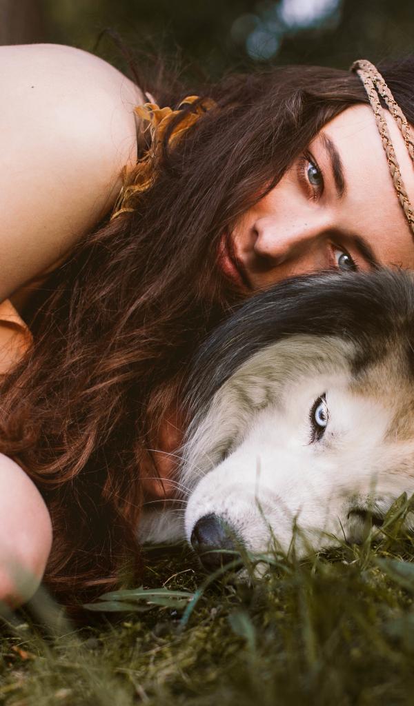 Wallpaper Young girl with a hussy breed dog lies on the grass