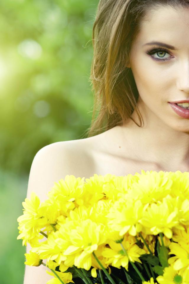 Wallpaper A real girl with a bouquet of yellow chrysanthemums