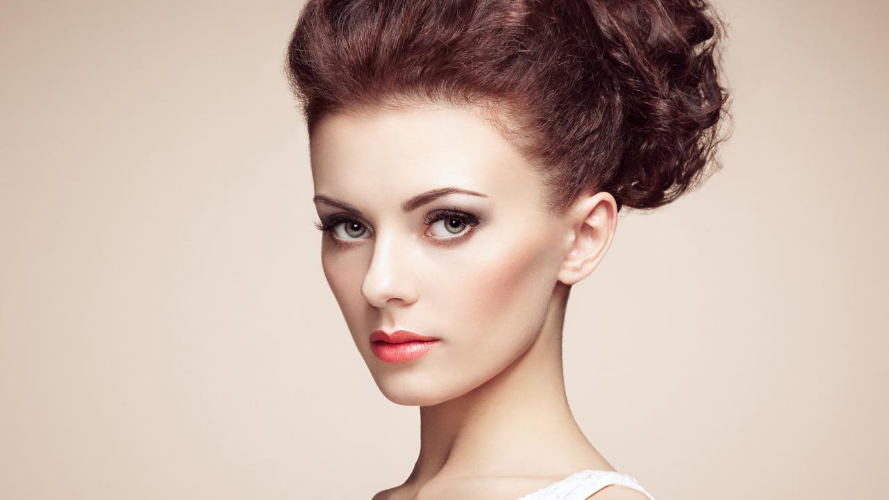 Wallpaper Beautiful gentle brown-haired woman with a hairdo on her head