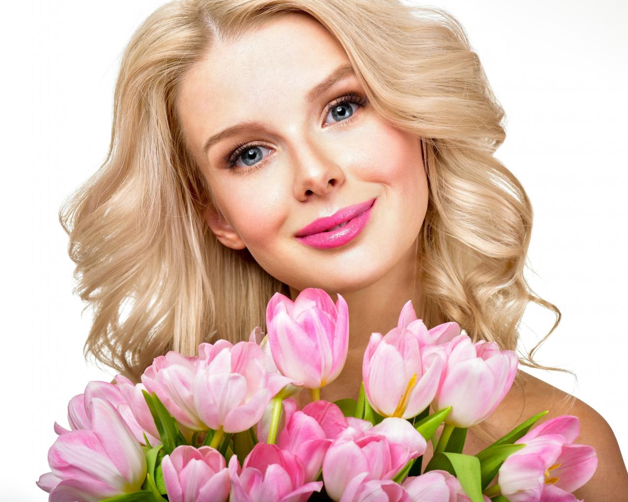 » Wallpaper Delicate blonde with a bouquet of pink tulips