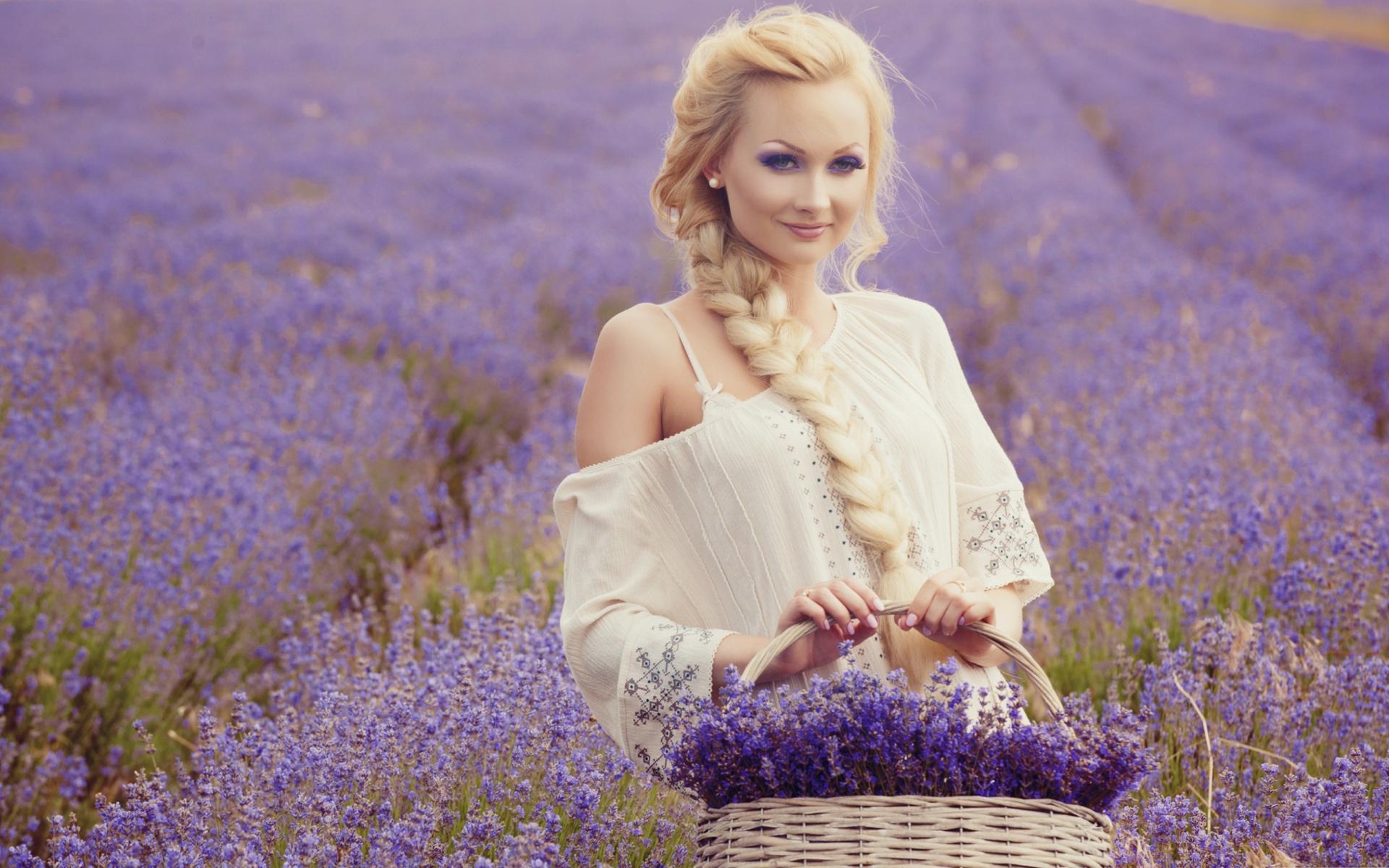 Wallpaper Beautiful blonde with a basket of lavender in hands