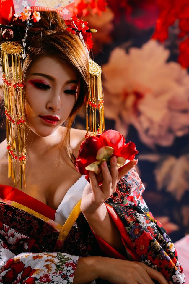 Wallpaper Beautiful asian girl in kimono with flower in hand