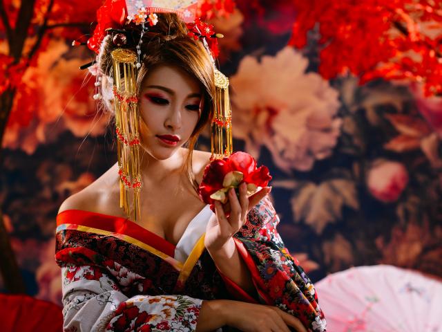 Wallpaper Beautiful asian girl in kimono with flower in hand