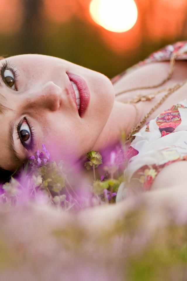 Wallpaper Young brown-eyed girl lies on the grass
