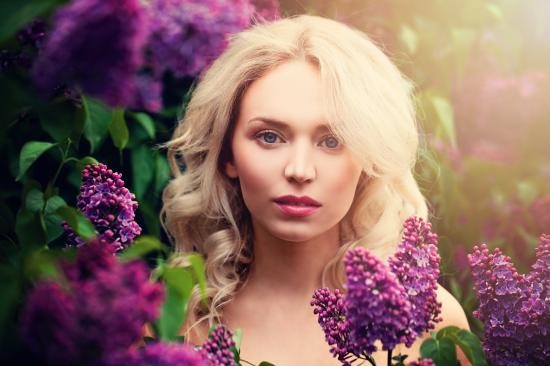 Wallpaper Beautiful blue-eyed blonde in lilac flowers
