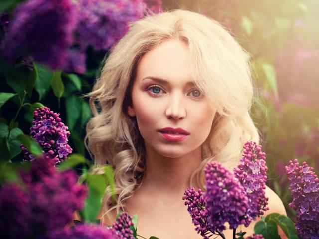 Wallpaper Beautiful blue-eyed blonde in lilac flowers