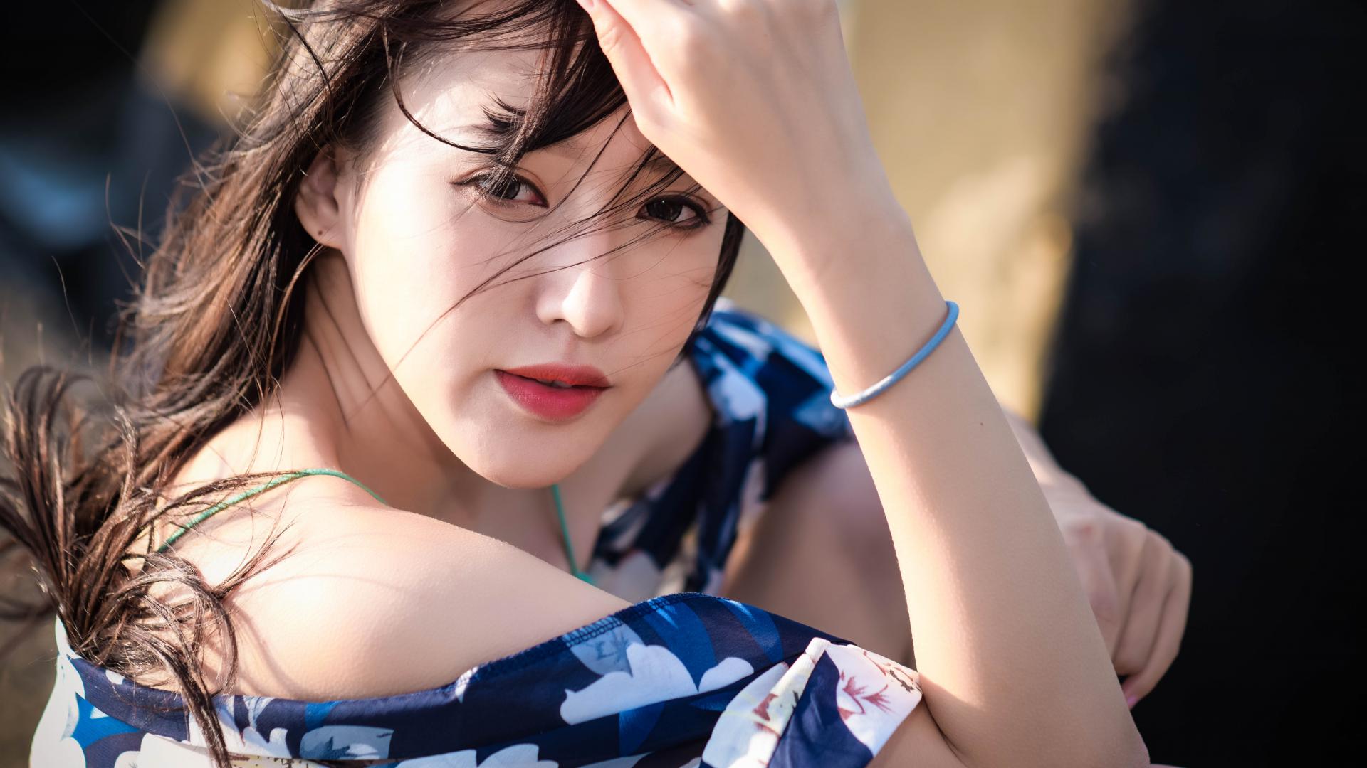 Wallpaper Beautiful Asian woman stands by a brick wall