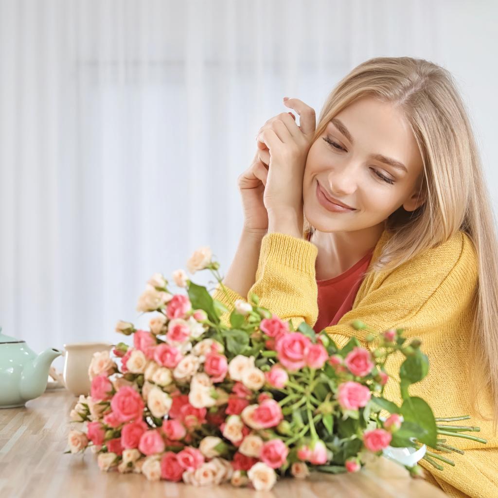 Wallpaper Young blonde with a bouquet of roses on a table