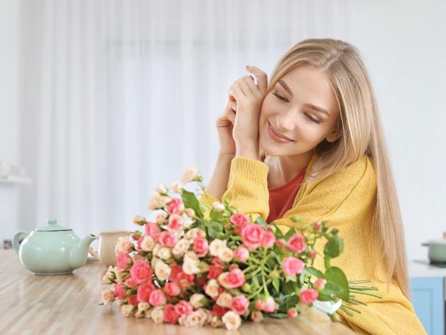 Wallpaper Young blonde with a bouquet of roses on a table