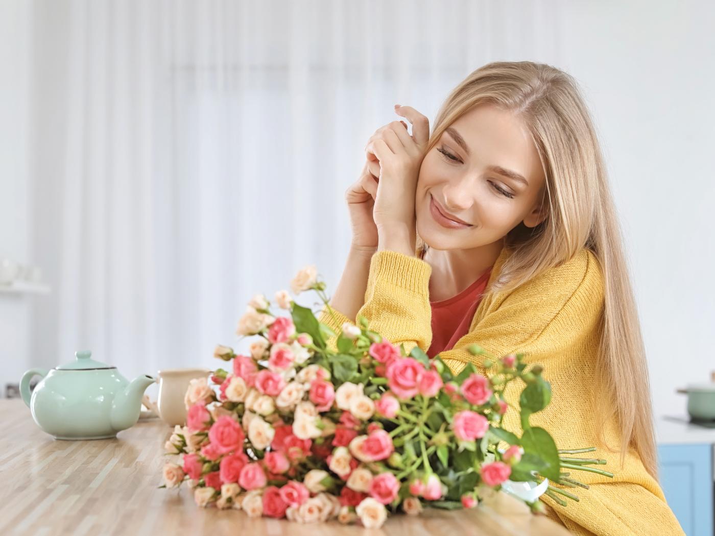 Wallpaper Young blonde with a bouquet of roses on a table