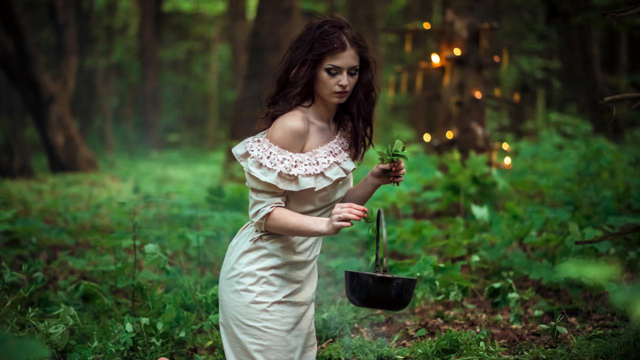 Wallpaper Young witch girl brewing a potion in the forest