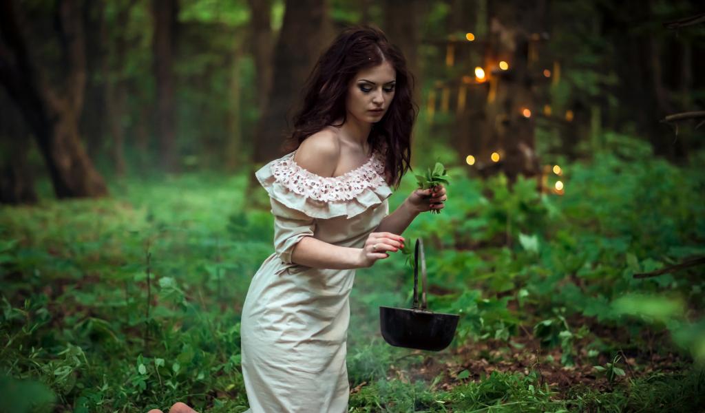Wallpaper Young witch girl brewing a potion in the forest