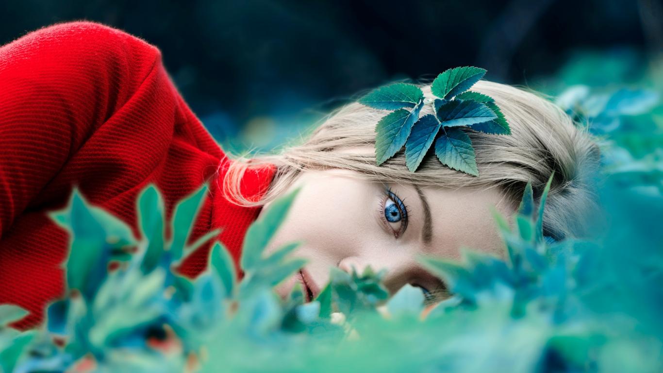 Wallpaper A blue-eyed girl in a red sweater lies in green leaves