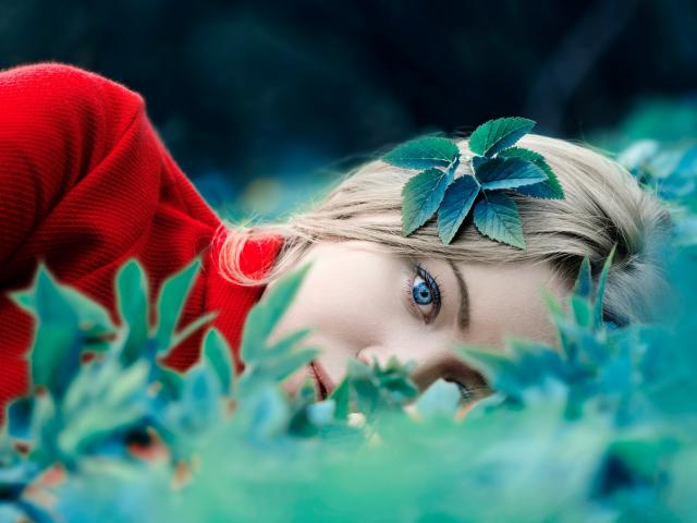 Wallpaper A blue-eyed girl in a red sweater lies in green leaves