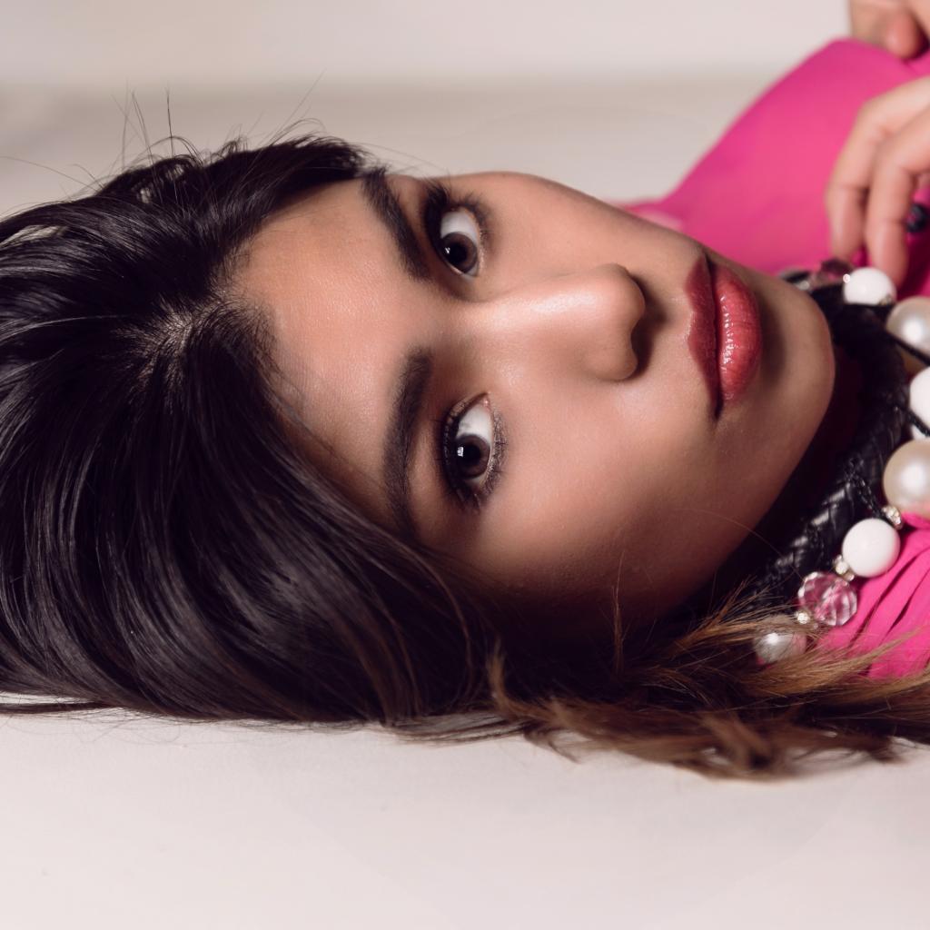 Wallpaper Beautiful brunette with big beads around her neck