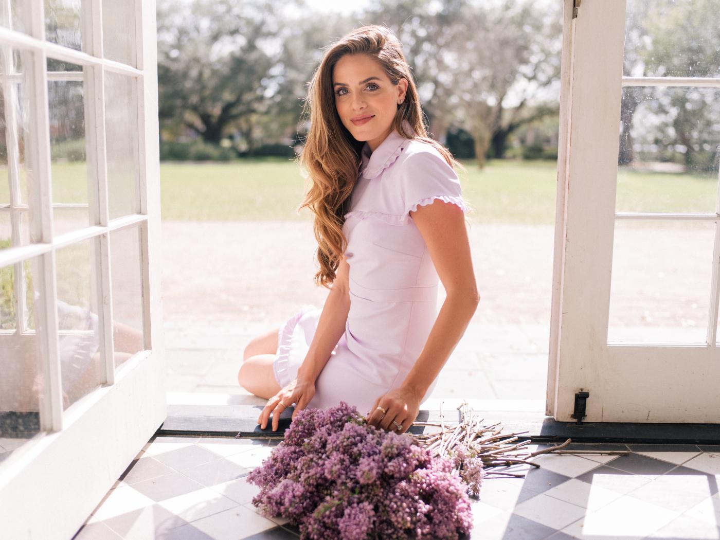 Wallpaper Beautiful girl in a dress with a bouquet of lilacs