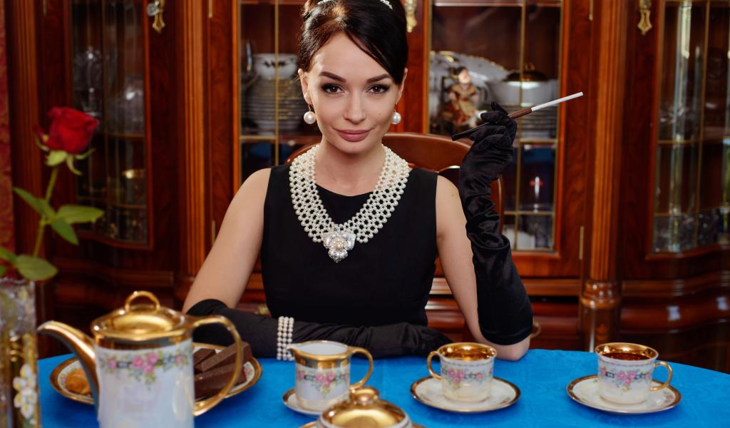 Wallpaper Stylish girl in retro style at the table with tea