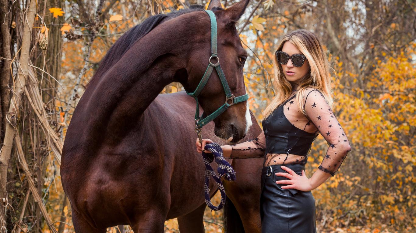 Wallpaper Stylish girl in black dress with a horse
