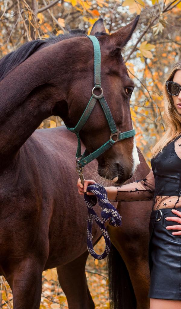 Wallpaper Stylish girl in black dress with a horse