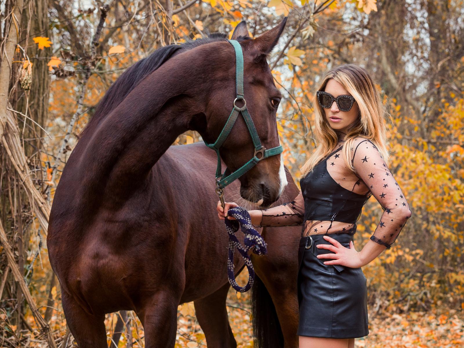 Wallpaper Stylish girl in black dress with a horse