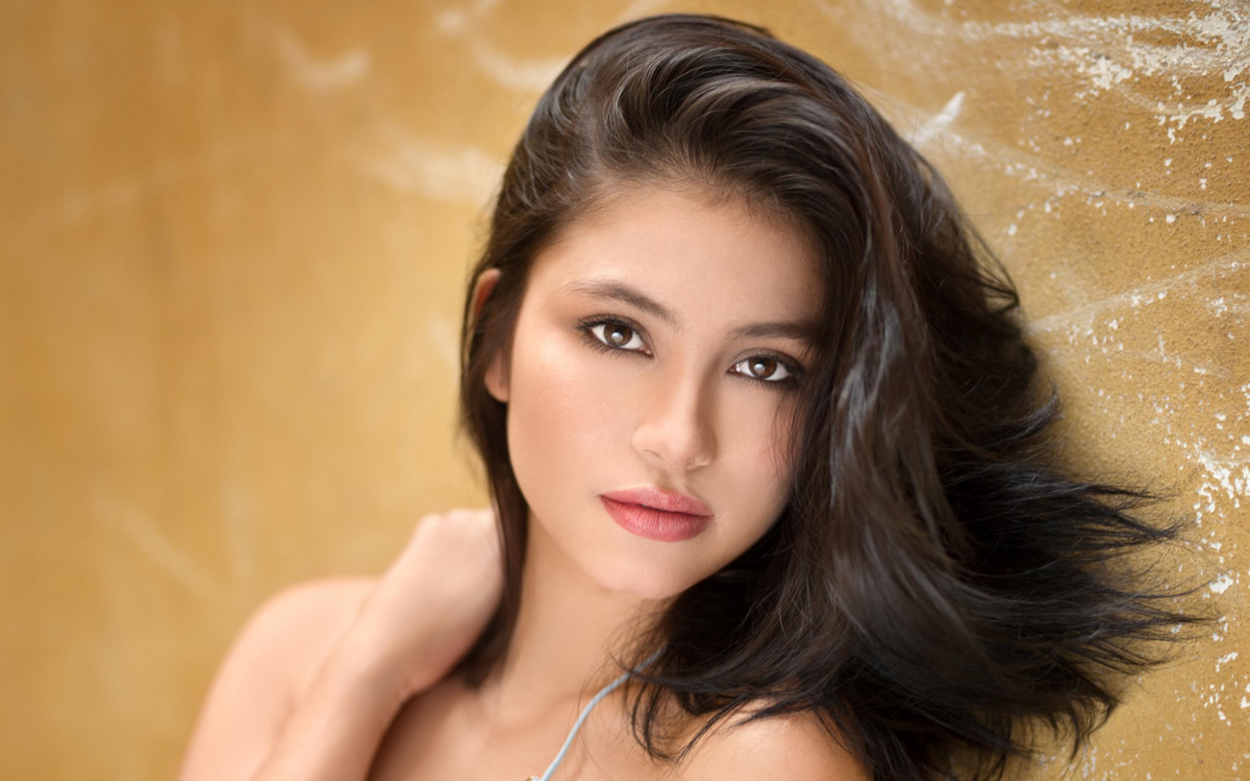 Wallpaper Beautiful brunette on wall background