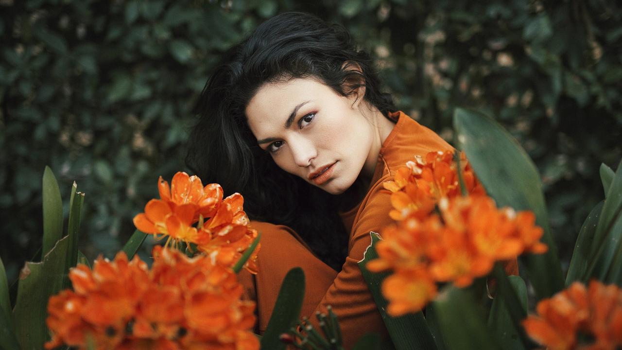 Wallpaper Beautiful brunette with orange flowers