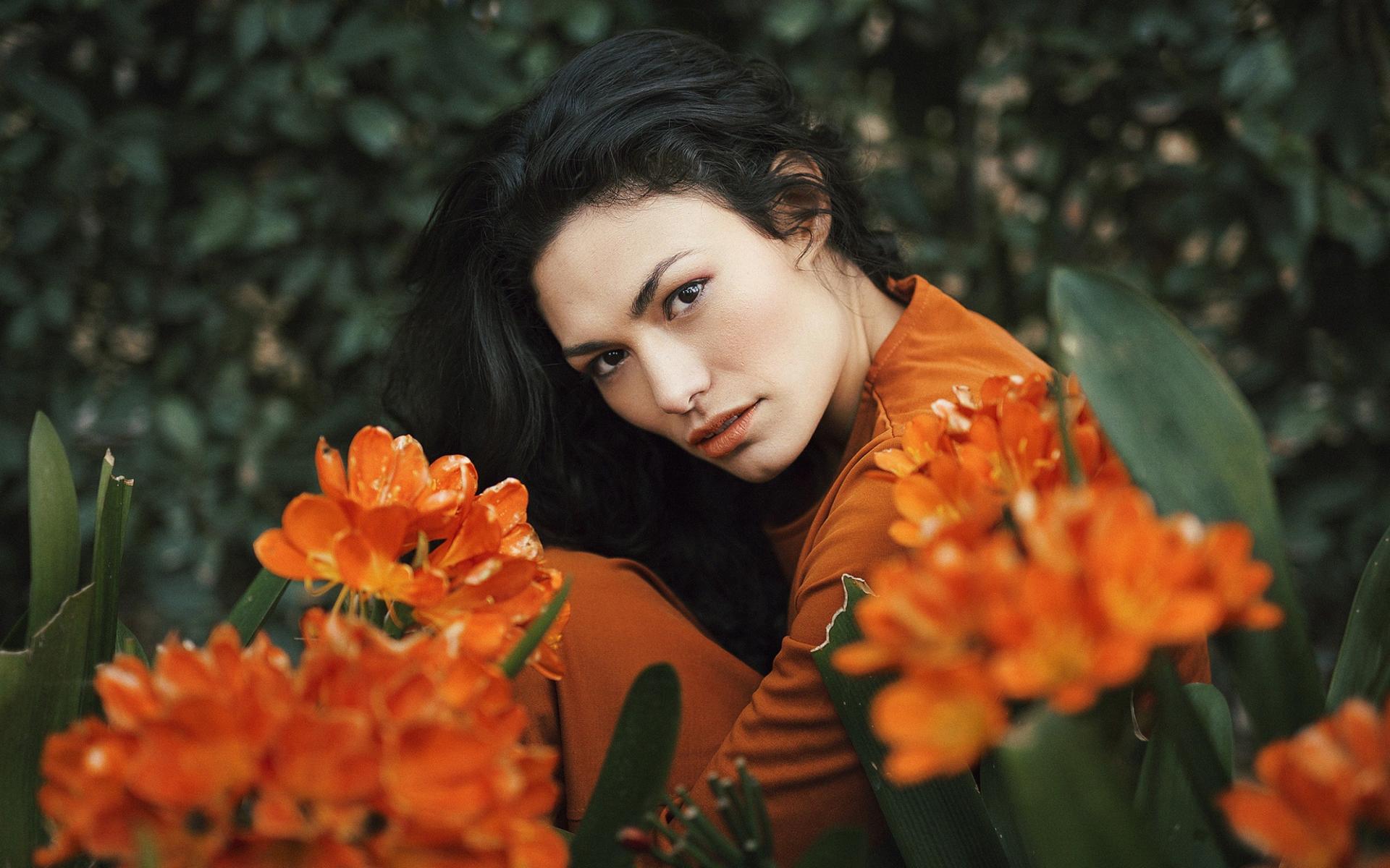 Wallpaper Beautiful brunette with orange flowers