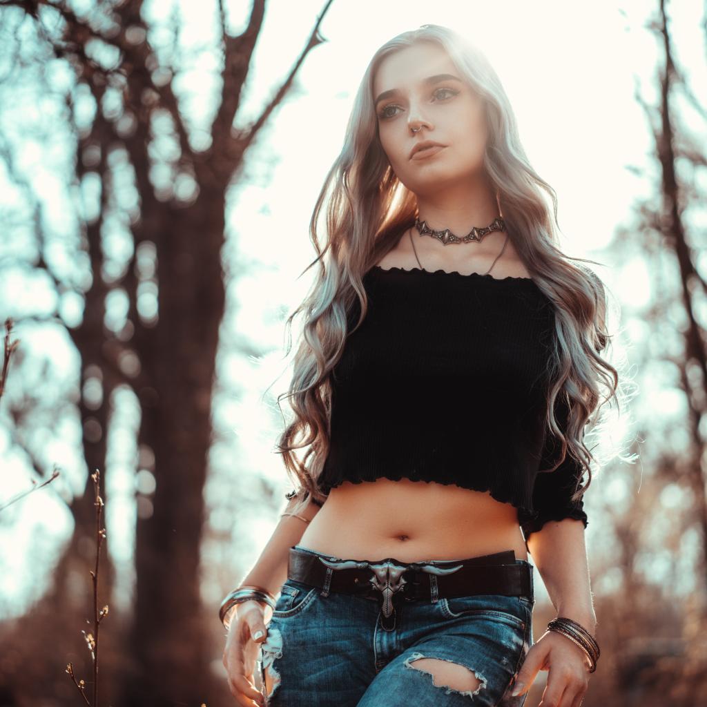 Wallpaper Young girl in torn jeans with a piercing in the nose