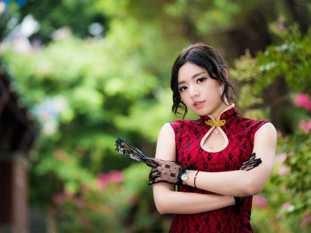 Wallpaper Beautiful asian girl with a fan in her hand