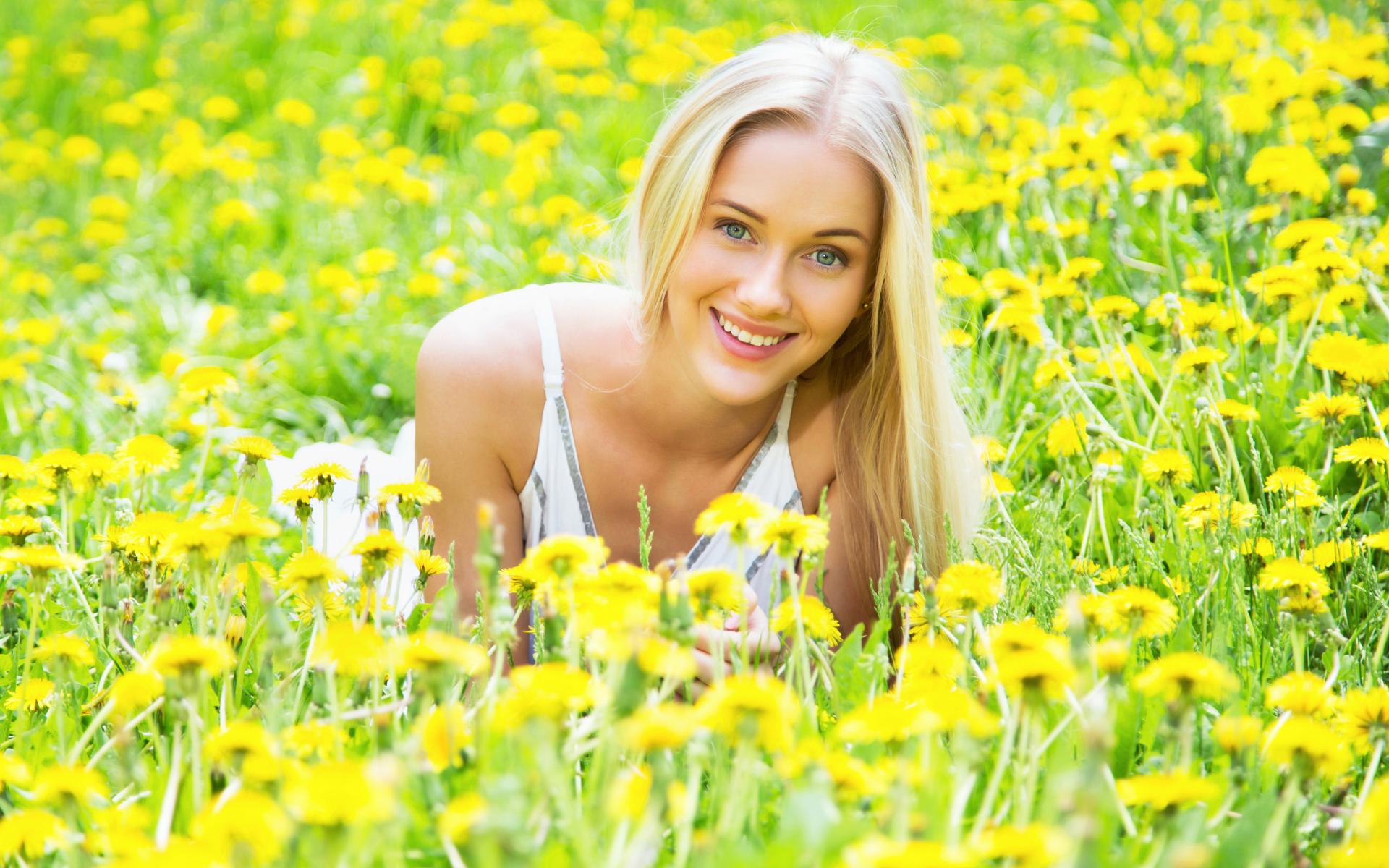 Wallpaper Beautiful smiling blonde in yellow dandelions