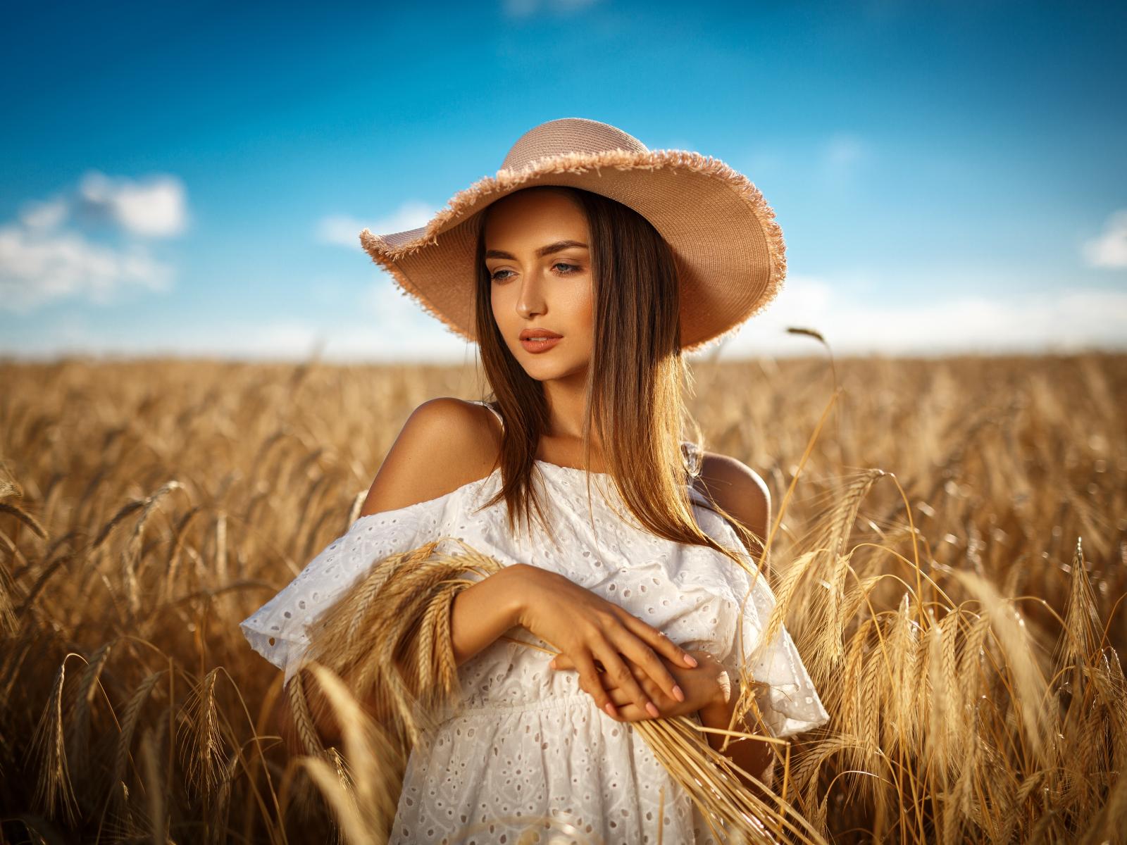 Wallpaper Beautiful girl in a white dress with wheat ears