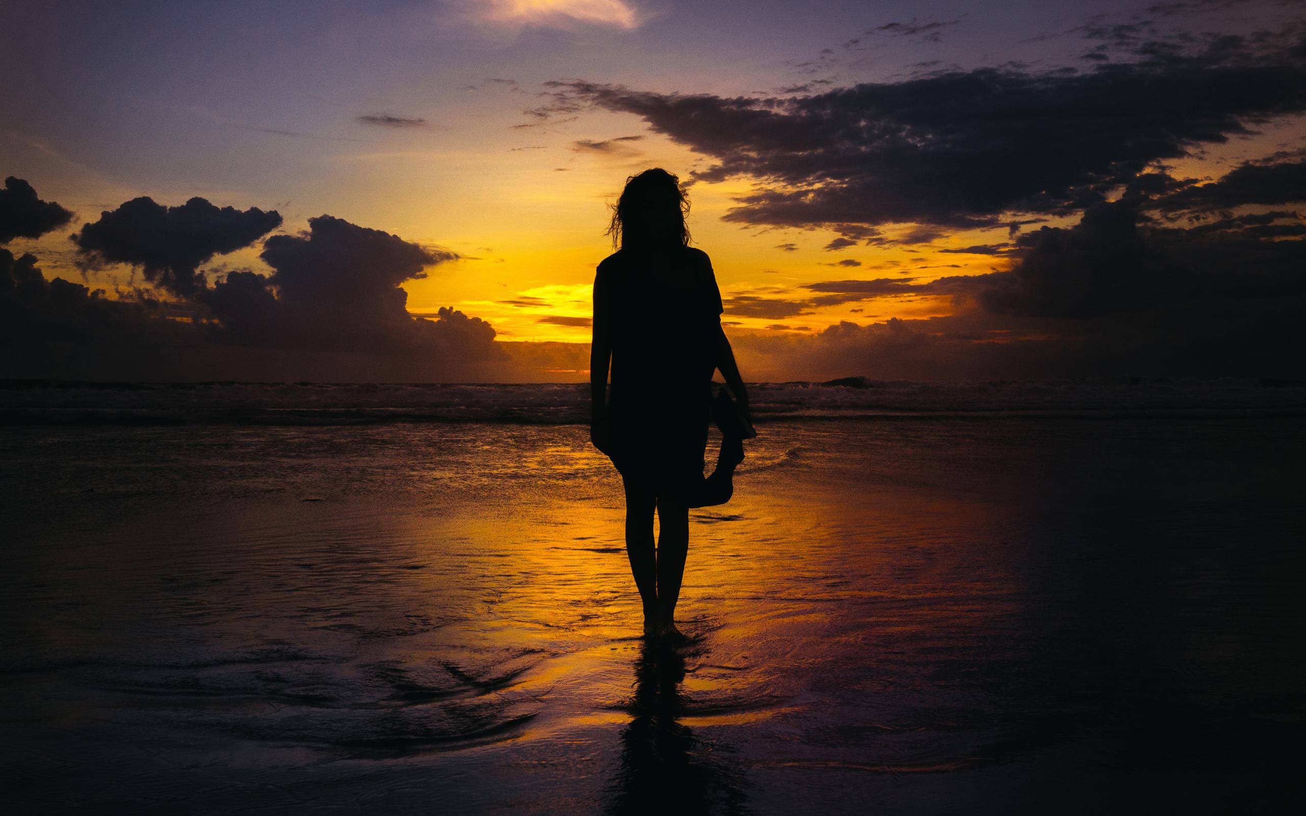 Wallpaper Silhouette of a beautiful girl on the beach at sunset