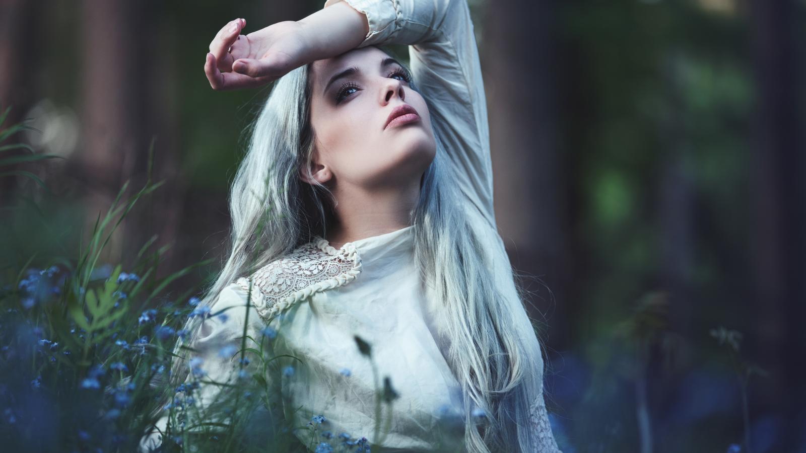 » Wallpaper Sad young blonde in blue flowers