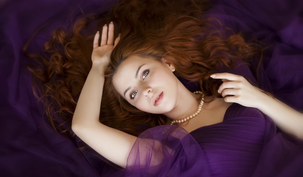 Wallpaper Beautiful red-haired girl in lays in purple dress