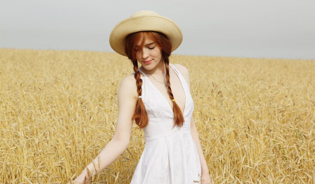 Wallpaper Young girl in white dress on field with wheat