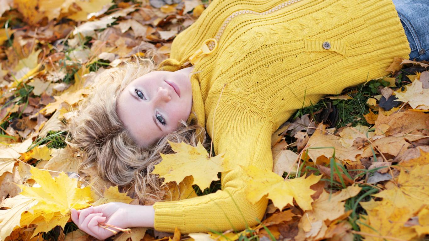 Wallpaper Young blonde lies on dry foliage in autumn