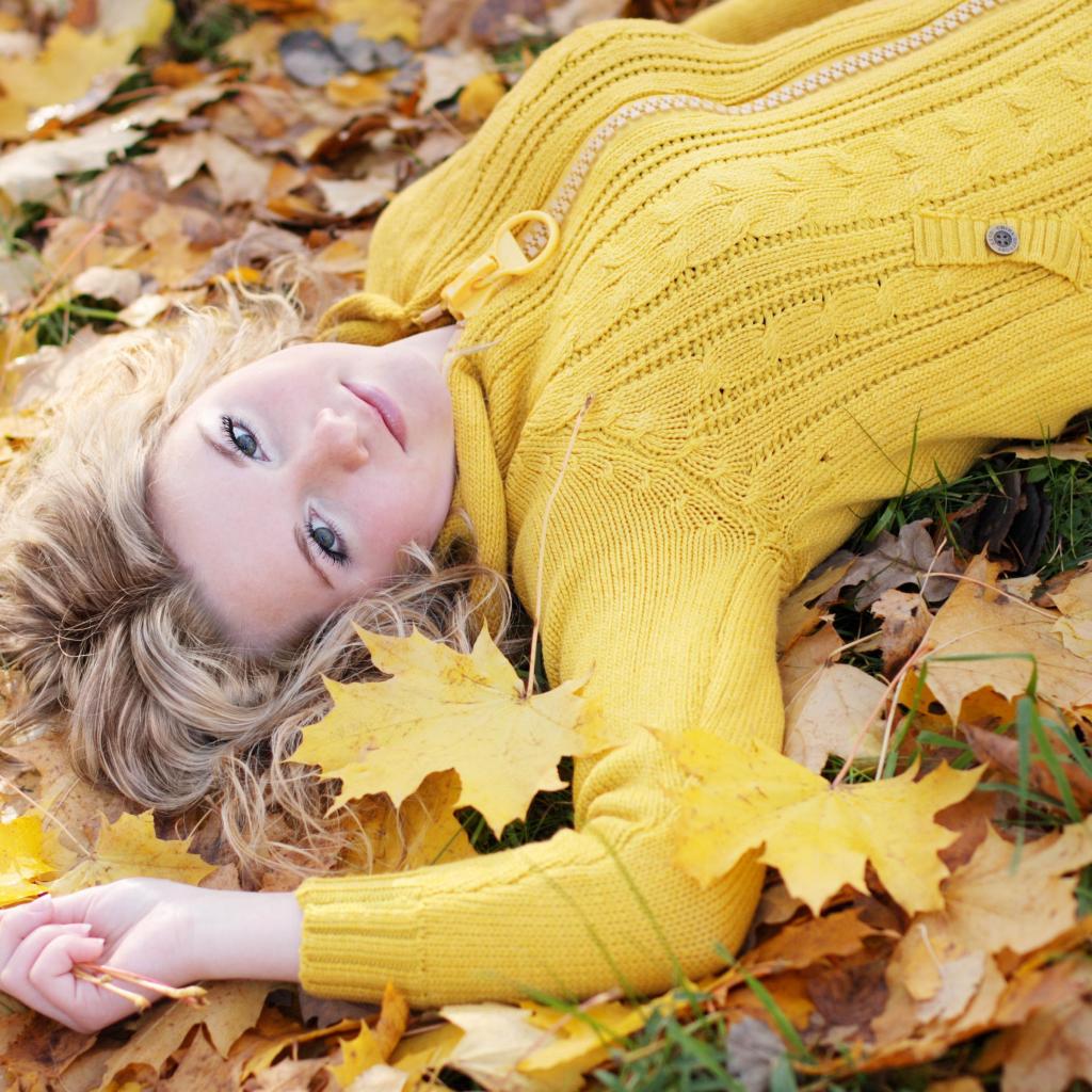 Wallpaper Young blonde lies on dry foliage in autumn