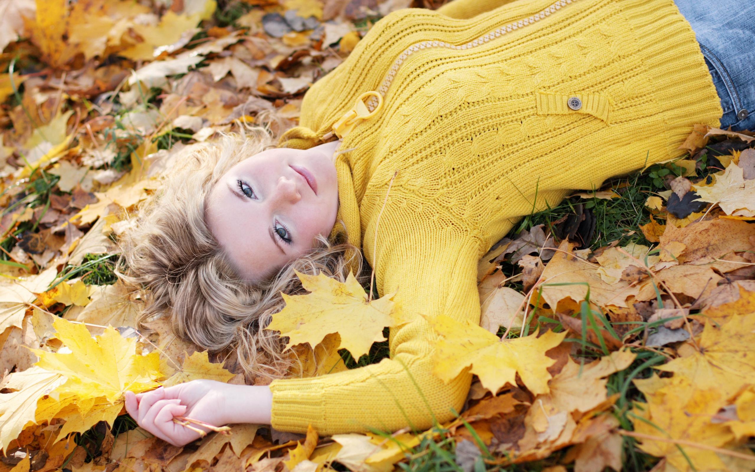 Wallpaper Young blonde lies on dry foliage in autumn