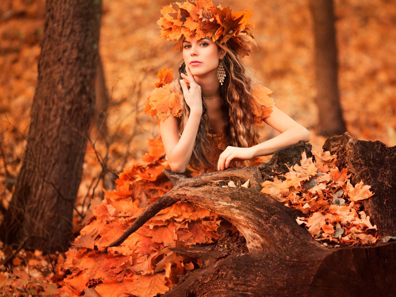 Wallpaper Beautiful autumn girl in a suit of yellow leaves
